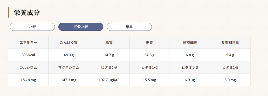 特に注目すべきは無料で変更できる「五穀ご飯」セット時の数値です。